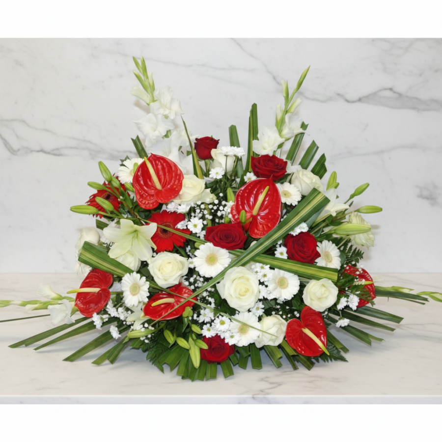 Ce bouquet de deuil accompagnera votre pensée dans le soutien de la douleur d’une famille ayant perdu un être cher. Fleurs et feuillages lui confèrent contraste et raffinement. La tendance actuelle étant à la conception de bouquets classiques, il n’a pas de connotation de deuil, mais un témoignage en toute simplicité de votre attachement à la personne défunte ou à sa famille.