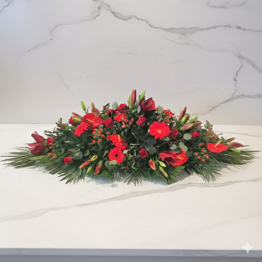 Composé de fleurs de saison en fonction des disponibilités, il est livré avec sa réserve d’eau pour prolonger sa durée de vie. Il convient aussi bien au lieu de cérémonie, qu’au domicile de la famille avant, pendant ou même après que l’hommage ait été rendu.
