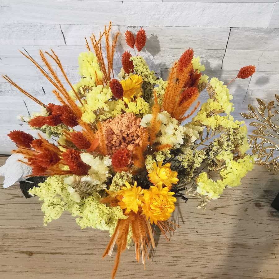 Très tendance, les fleurs séchées font leur retour en force ces dernières années et pour cause ! De très longue durée en bouquets ou en composition, elles assurent la décoration sans besoin d’un contraignant entretien ! Texturées, colorées, leur charme n’est plus à prouver ! Chaque création est unique et fera donc l’objet de tous les soins de notre équipe de fleuristes pour agencer les végétaux tantôt de manière champêtre pour orner à merveille un intérieur classique ou pour accompagner une déco de style cocooning, tantôt de manière plus contemporaine ou graphique pour correspondre aux goûts plus marqués en matière de design.