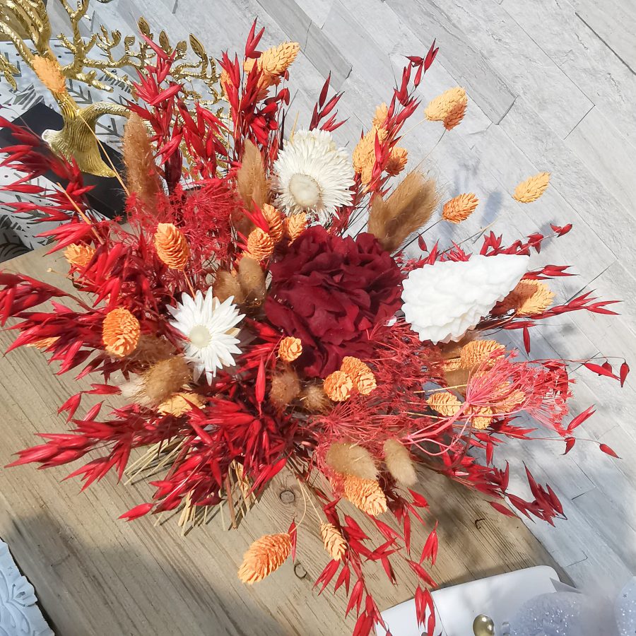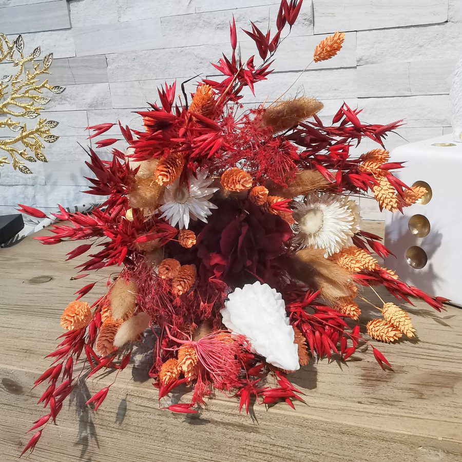 Très tendance, les fleurs séchées font leur retour en force ces dernières années et pour cause ! De très longue durée en bouquets ou en composition, elles assurent la décoration sans besoin d’un contraignant entretien ! Texturées, colorées, leur charme n’est plus à prouver ! Chaque création est unique et fera donc l’objet de tous les soins de notre équipe de fleuristes pour agencer les végétaux tantôt de manière champêtre pour orner à merveille un intérieur classique ou pour accompagner une déco de style cocooning, tantôt de manière plus contemporaine ou graphique pour correspondre aux goûts plus marqués en matière de design.