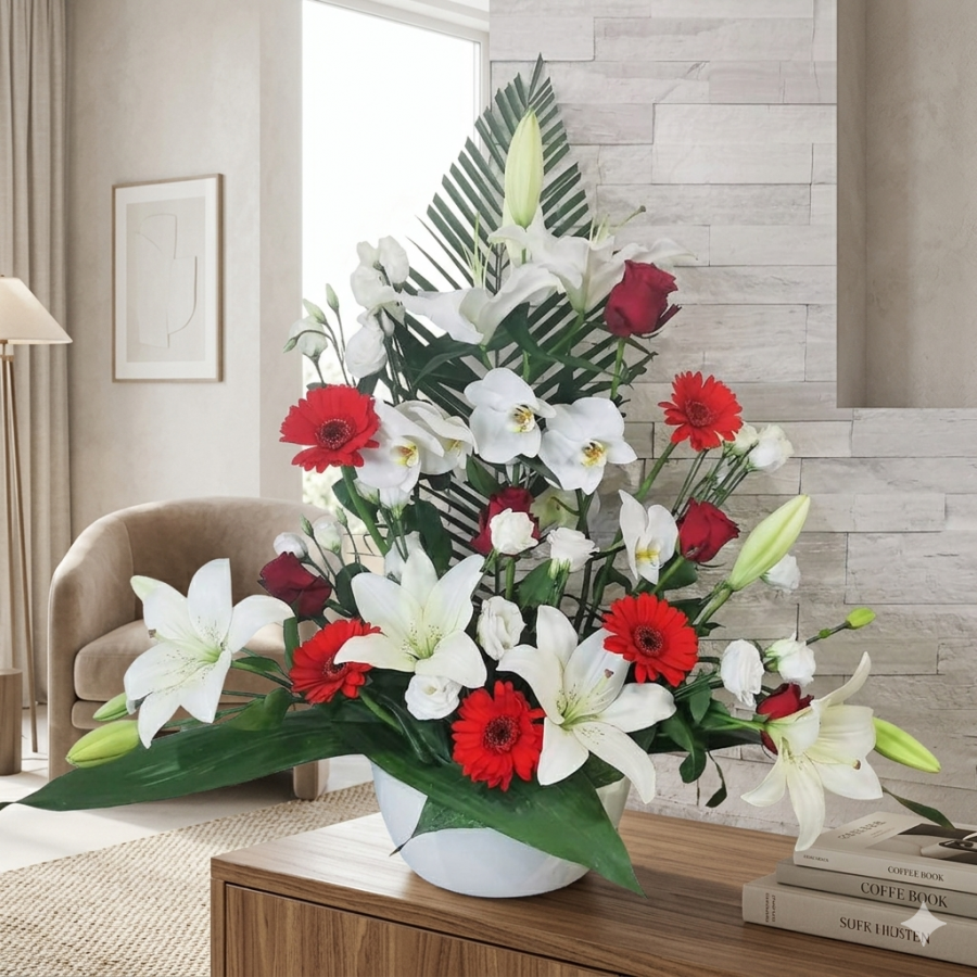 Lovée dans un contenant en céramique blanche, cette composition attire immédiatement tous les regards ! Reposant sur une feuille de palmier qui lui sert de toile de fond elle impose la splendeur des fleurs de l’orchidée phalaenopsis dans sa version blanche et des somptueux lys blanc qui les entourent. La rondeur des roses et des lisianthus blancs fait écho à celle des germinis rouge vif et des roses carmin. Une composition prestigieuse qui fera son effet sur une table de fête pour célébrer tous les joyeux événements que la vie mettra sur votre chemin !