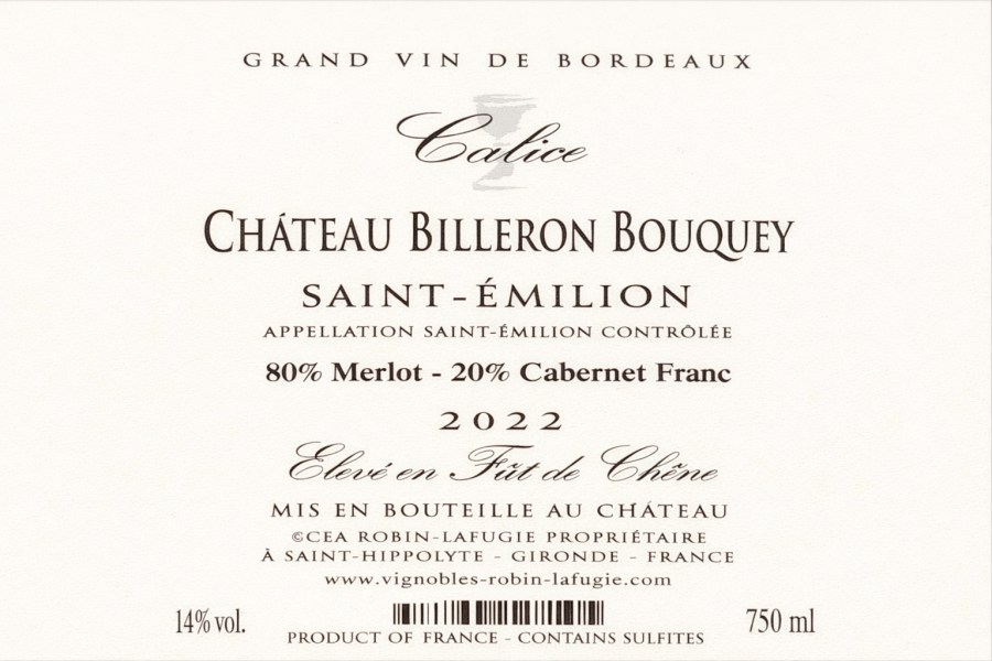Vin Rouge AOP ST EMILION ROUGE 2022 CUVEE CALICE CHATEAU BILLERON BOUQUEY